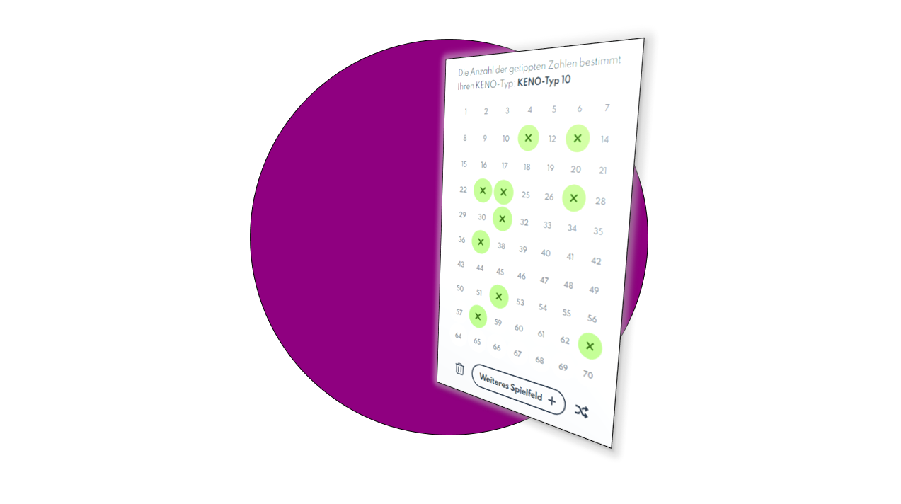 Ein KENO-Spielschein besteht aus fünf Spielfeldern, auf denen sich jeweils Zahlen von 1 bis 70 befinden. Wählen Sie in einem Spielfeld zwei bis max. zehn Zahlen aus, die Ihrer Meinung nach unter den 20 gezogenen KENO-Gewinnzahlen der nächsten Ziehung sein werden. Mit der Anzahl der von Ihnen gewählten Zahlen bestimmen Sie Ihren KENO-Typ.