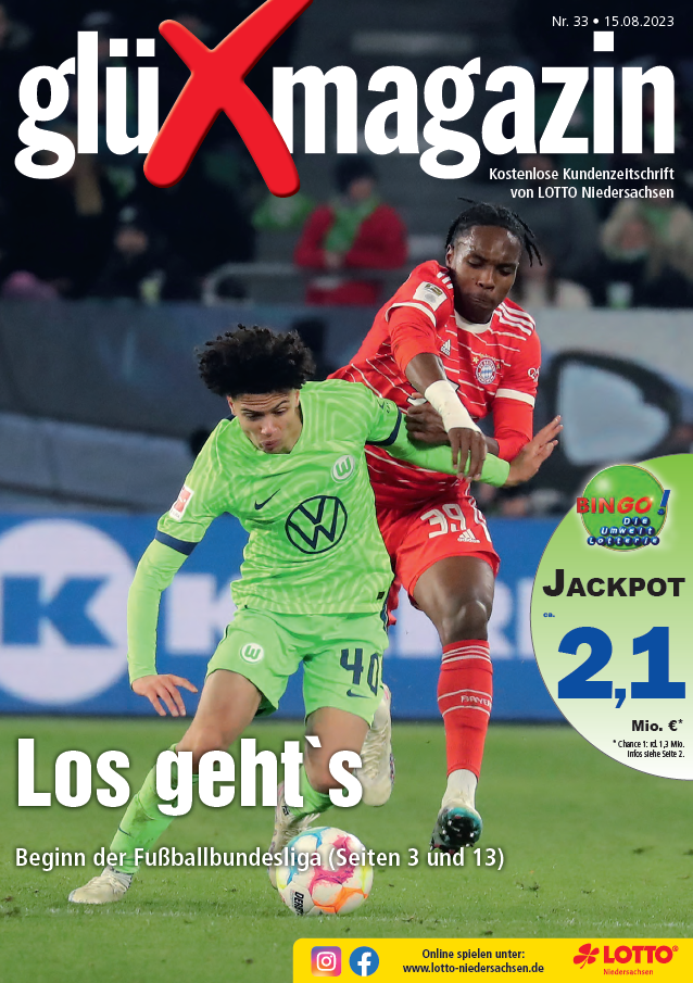 Werfen Sie einen Blick in die digitale Ausgabe unserer wöchentlichen Kundenzeitschrift, dem glüXmagazin. Sie erwarten spannende Neuigkeiten aus der LOTTO-Welt, können Inhalte vergrößern, Rätsel digital lösen und Verlinkungen zu weiterführenden Informationen nutzen. Viel Spaß beim Lesen! Die gedruckte Variante erhalten Sie kostenfrei in jeder Annahmestelle von LOTTO Niedersachsen.